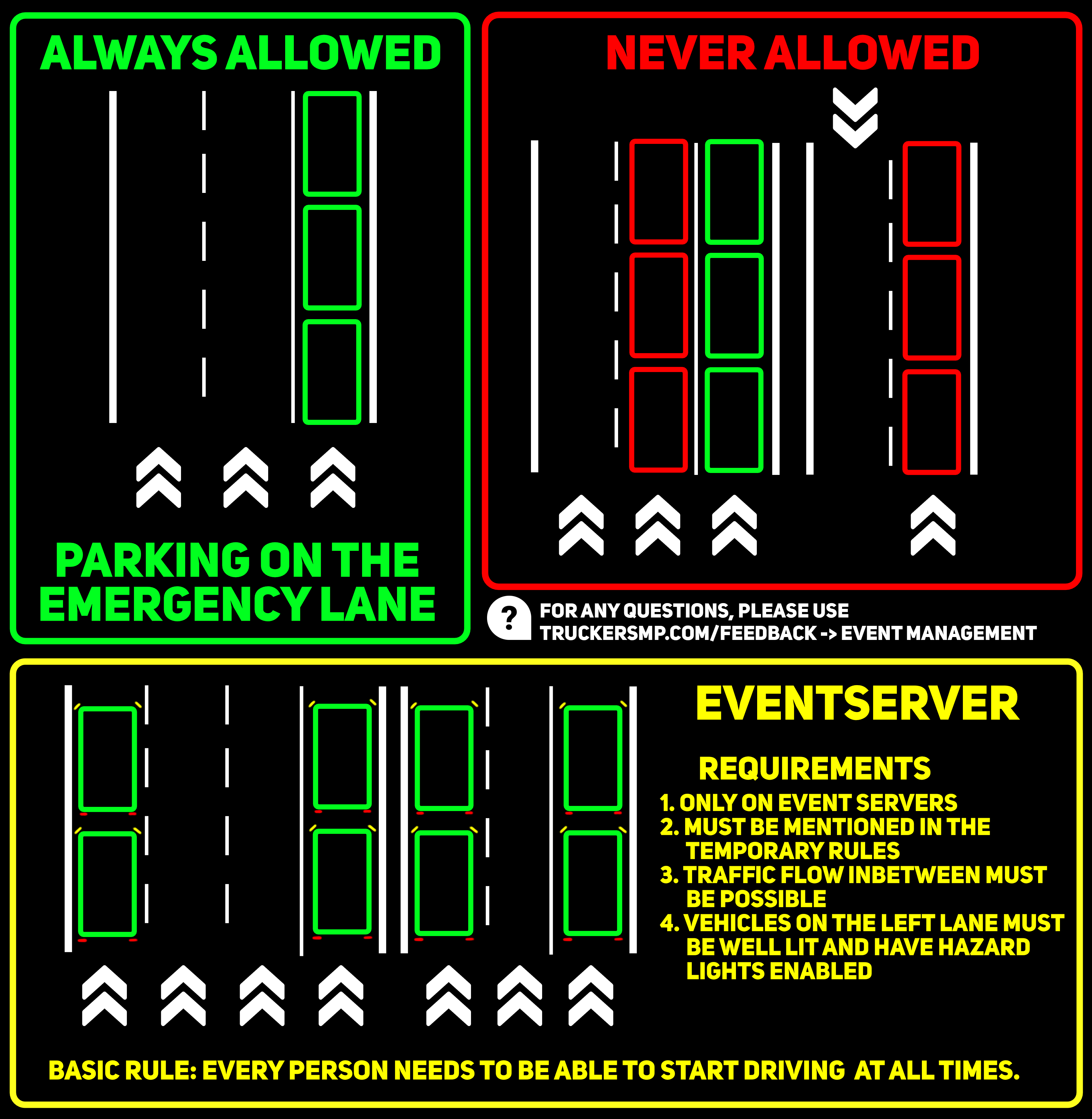活动工作人员可以在限制区域外停车,但前提是设备必须停放在地面上,不得停放在建筑物或其他 TruckersMP 工作人员认为不合适的地点。